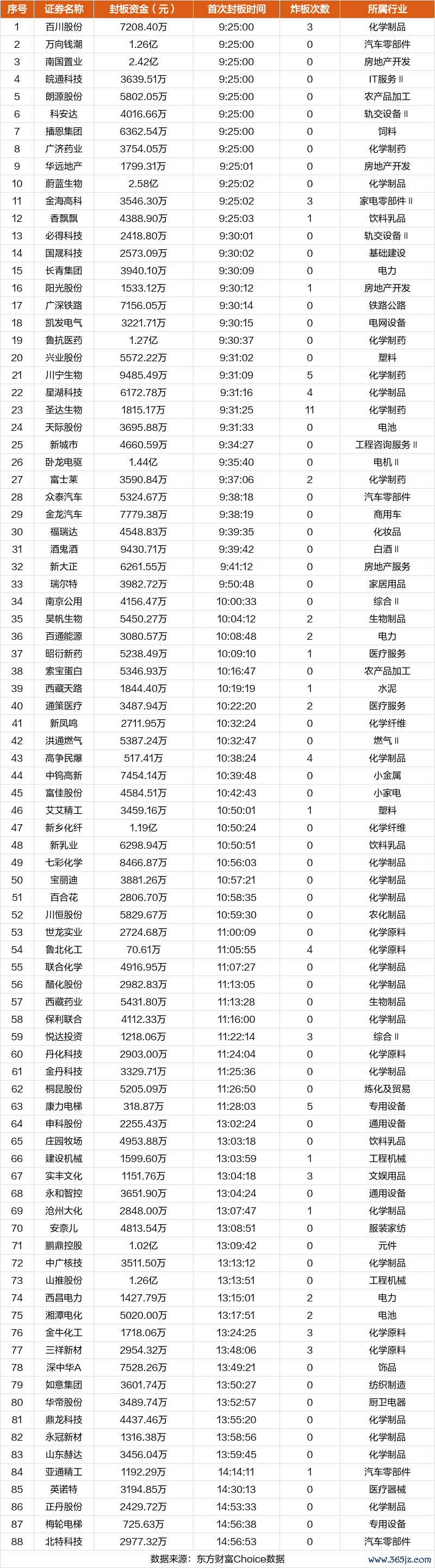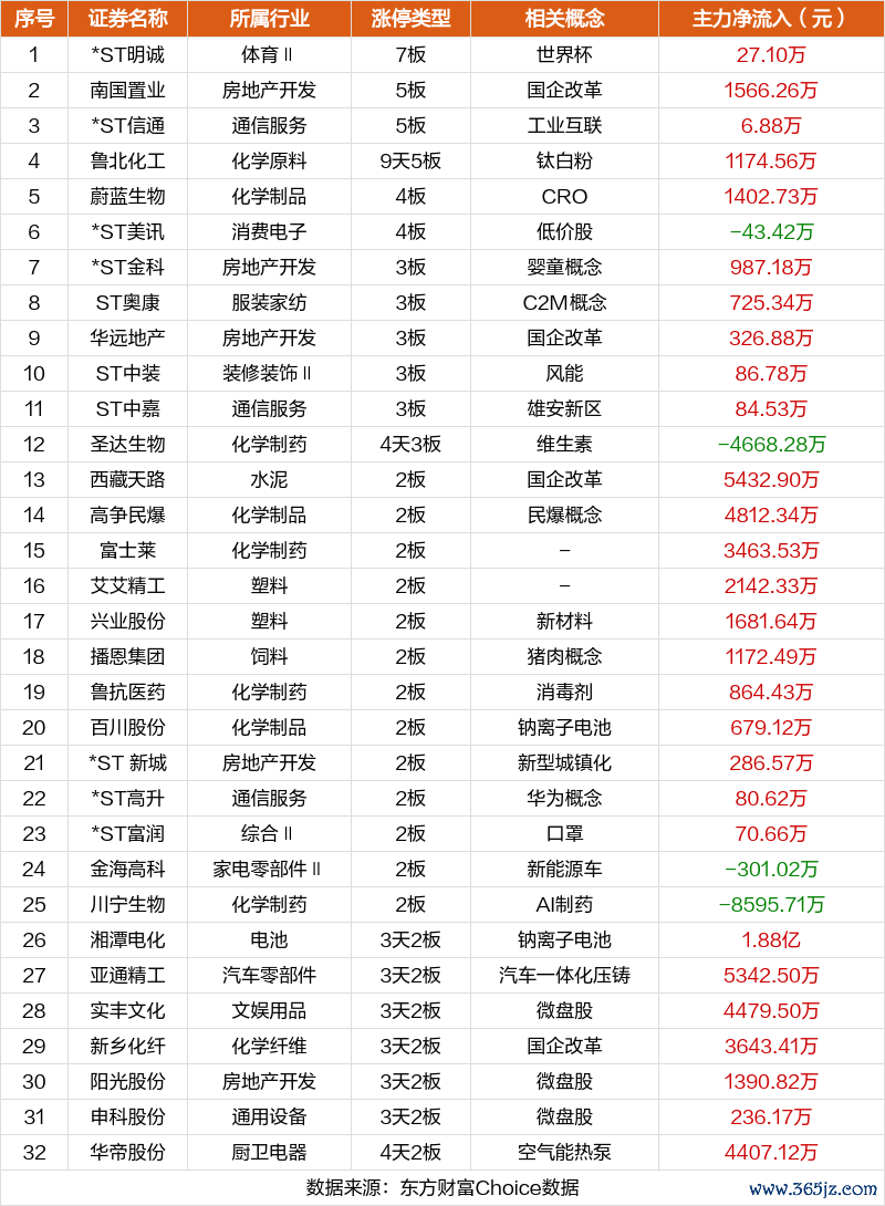 今日(5月6日)两市4515只个股上涨,740只个股下跌,成交额1.1万亿,较上个交易日放量718.57亿。三大指数均上涨,截止收盘,沪指涨1.16%,深成指涨2.00%,创业板指涨1.98%。 板块方面,化学原料、化学制品、生物制品等板块涨幅居前,教育、旅游酒店、银行等板块跌幅居前。 5月6日板块涨跌幅前10 ![]() 今日连板个股涨停统计 涨停家数方面,今日合计有105股涨停,上个交易日76股涨停。 其中,世界杯*ST明诚7板,国企改革南国置业5板,工业互联*ST信通5板。 5月6日连板个股涨停统计 ![]() 注:主板涨跌停板为10%,ST为5%;创业板、科创板为20%;北交所为30%。 今日非连板个股涨停统计 非连板个股方面,卧龙电驱、酒鬼酒、三祥新材主力资金净流入居前。 5月6日非连板个股涨停统计 ![]() 注:主板涨跌停板为10%,ST为5%;创业板、科创板为20%;北交所为30%。 今日非ST股涨停触板时间统计 从首次封板时间角度看,今日88只非ST股中,必得科技、国晟科技、长青集团等在开盘5分钟内首次触板。 5月6日非ST股首次封板时间统计 ![]() 免责声明:本文基于大数据生产,仅供参考,不构成任何投资建议,据此操作风险自担。 文章来源:东方财富Choice数据 郑重声明:本信息来源于东方财富Choice数据,相关数据仅供参考,不构成投资建议。东方财富网力求但不保证数据的完全准确,如有错漏请以中国证监会指定上市公司信息披露媒体为准,东方财富网不对因该资料全部或部分内容而引致的盈亏承担任何责任。用户个人对服务的使用承担风险,东方财富网对此不作任何类型的担保。 举报 东方财富网 分享到微信朋友圈打开微信, 点击底部的“发现” 使用“扫一扫” 即可将网页分享至朋友圈